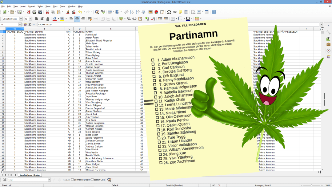 Partiernas riksdagslistor finns nu publicerade hos Valmyndigheten. Det gör att alla aktivister som bryr sig om någon särskild politisk fråga kan börja leta efter riksdagskandidater som de tycker är bra i den frågan. För vår del innebär det att vi kan börja leta upp namnen på politiker som vill legalisera cannabis och lägga om den … Fortsätt läsa Riksdagslistorna publicerade hos Valmyndigheten